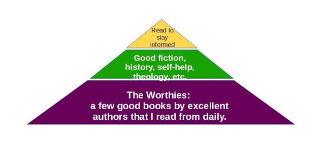 Another way to understand my approach to reading is like a food pyramid: the base of which would be the Worthies, and then on top of them would be books that find their place in the green group, after which is the yellow group, and the red group is left out completely.