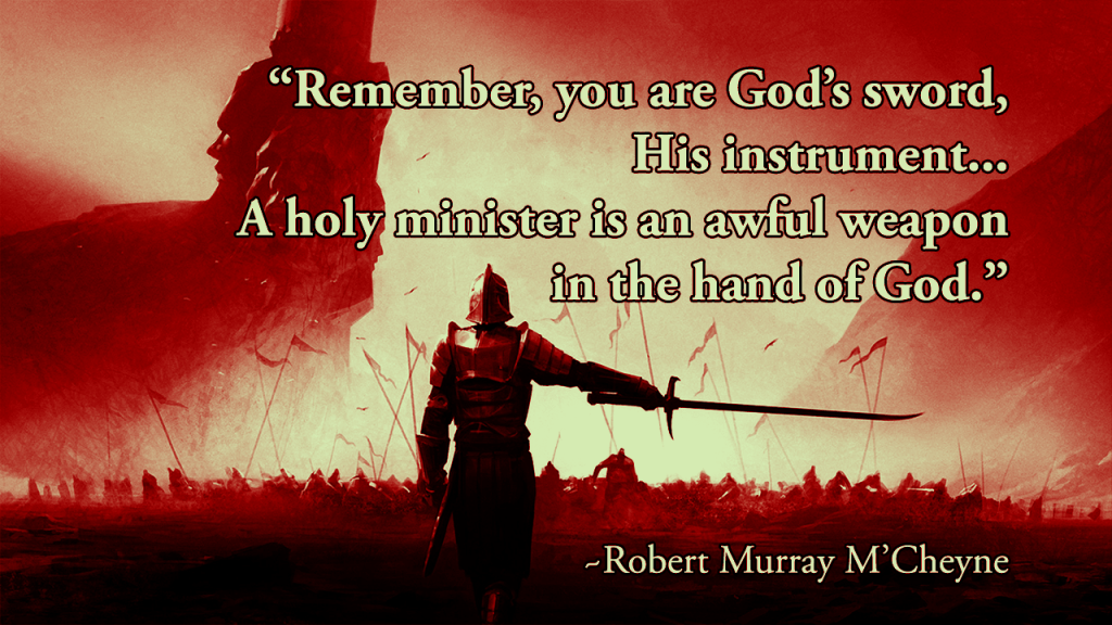 He then adds a quote that Robert Murray M’Cheyne said in a letter to a minister-friend: “…do not forget the culture of the inner man….Remember you are God’s sword, His instrument…In great measure, according to the purity and perfection of the instrument, will be the success. It is not great talents that God blesses so much as likeness to Jesus. A holy minister is an awful weapon in the hand of God.”